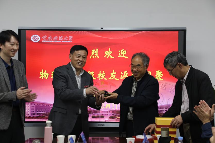 校友发言阶段,现场氛围热烈而温馨。校友代表段泰崃表示为学院的发展与成就感到欣喜与自豪。再次返回母校,回忆起青春岁月心潮澎湃,他现场朗诵了为本次同学会创作的诗歌,抒发对母校、恩师和同窗的感念之情。校友何大同代表77级物理系校友向学院赠送了“惟宏隆德,情系教育”水晶牌,感谢多年来学院对各届学子的悉心培育。同时,他们为77级物理系授业恩师准备了“师恩如海,吾爱吾师”水晶牌和礼物,恳请学院转交未能到场的恩师,以表达77级学子对老师们的感激之情。