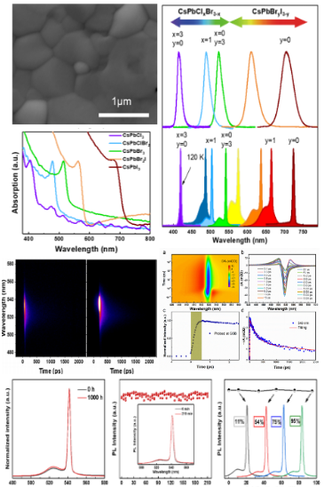 全无机钙钛矿CsPbX3(X=Cl、Br、I,或混合Cl / Br和Br / I)具有优异的光学增益特性,是实现片上相干光源的理想材料。传统高质量的钙钛矿多晶薄膜的制备需要手套箱和反溶剂处理,但反溶剂工程具有繁琐过程和需要更高的操作技术和环境要求,导致钙钛矿薄膜的重现性差和缺陷密度高。此外,传统有机溶剂的高毒性和高沸点不仅会对生态环境造成危害,还会大大增加器件的制造成本,减缓其商业化的步伐。因此,开发低毒甚至无毒的溶剂体系用于钙钛矿薄膜的溶液处理是一个日益增长的需求。更重要的是,钙钛矿材料在温度、湿度和光照条件下的稳定性较差,导致ASE和激光性能的退化,仍是几乎所有钙钛矿材料和器件走向实际和商业应用的共同障碍。