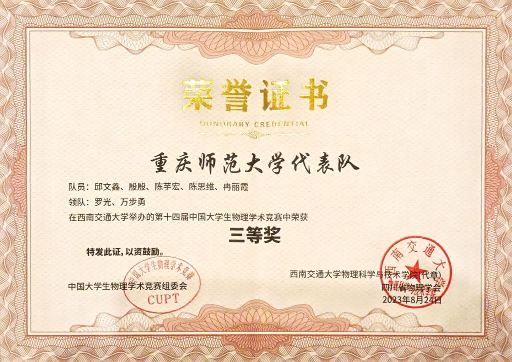 代表队(邱文鑫(队长)、殷殷、陈芋宏、陈思维、冉丽霞)在罗光、万步勇、张菊花、徐一宁四位老师的倾力指导下,于今年4月在西南地区大学生物理学术竞赛中获团体一等奖,作为代表队之一代表西南地区高校参加全国总决赛。AV狼