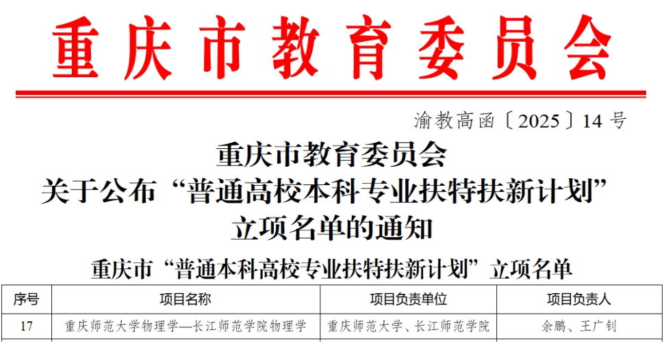物理学专业获批重庆市“普通高校本科专业扶特扶新计划”立项