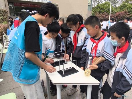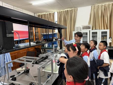 实验楼参观。实验楼外空地上,无线调频话筒、电磁炮等各类趣味实验,帮助学生理解电磁感应、信号处理等知识;实验楼内同样精彩纷呈,一楼的实验室里,学生通过扫描电子显微镜窥探微观世界,在激光实验室揭开了激光奥秘,不仅让同学们了解了OLED发光芯片制作过程,还能学习电子电路、材料制备等多样知识;二楼的计算模拟实验室、激光成像实验室以及展示创新科技成果的多个实验室,为学生打开虚拟研究大门并普及前沿科技知识;三楼充满互动体验乐趣,模拟触电仪、无皮鼓等互动装置,让学生在体验中学习电流特性、导电原理、磁场等知识,全方位展现科学的魅力与奥秘。