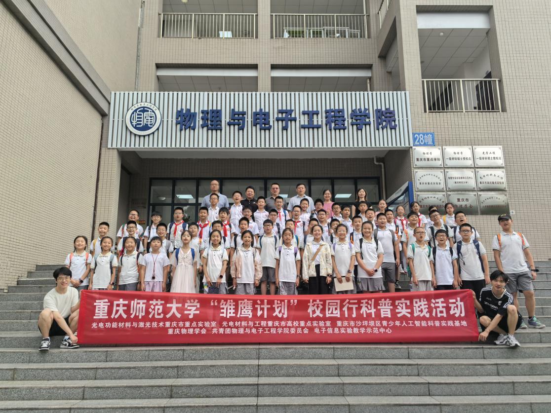 举办“雏鹰计划”校园行科普实践活动,来自重庆两江新区重光小学、重庆市大渡口区钰鑫小学的学生参与,开启奇妙科学之旅,激发小学生科学兴趣,普及科学知识。本次活动由光电功能材料与激光技术重庆市重点实验室、光电材料与工程重庆市高校重点实验室、重庆市沙坪坝区人工智能科普实践基地、重庆物理学会、电子信息实验教学示范中心、共青团AV狼