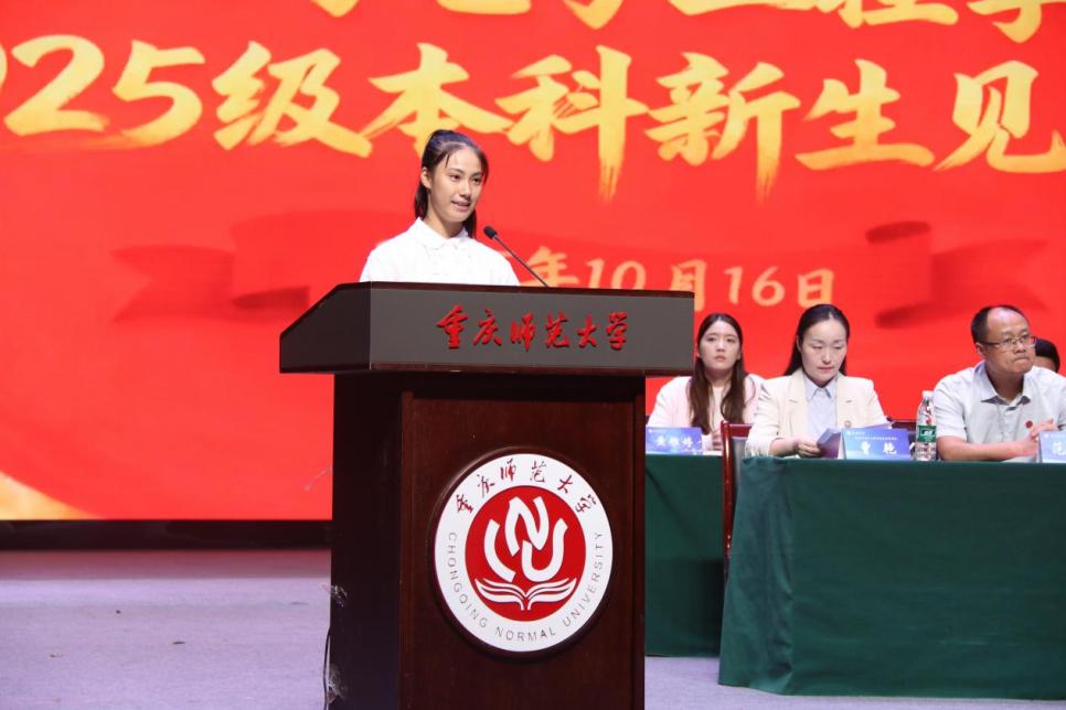 2025级物理学邓宇涵作为新生代表发言。她代表全体新生向学院领导、老师及工作人员致以诚挚感谢,感谢开学以来给予的指导与关怀。她表示,站在大学新起点,全体新生将以豪情与执着投入学习,以专注与勇气面对挑战,以自觉与担当肩负责任,在专业学习、社会实践等方面积极进取,将个人理想融入时代发展洪流,不负期望,待学成之时回报学院与学校的培育。