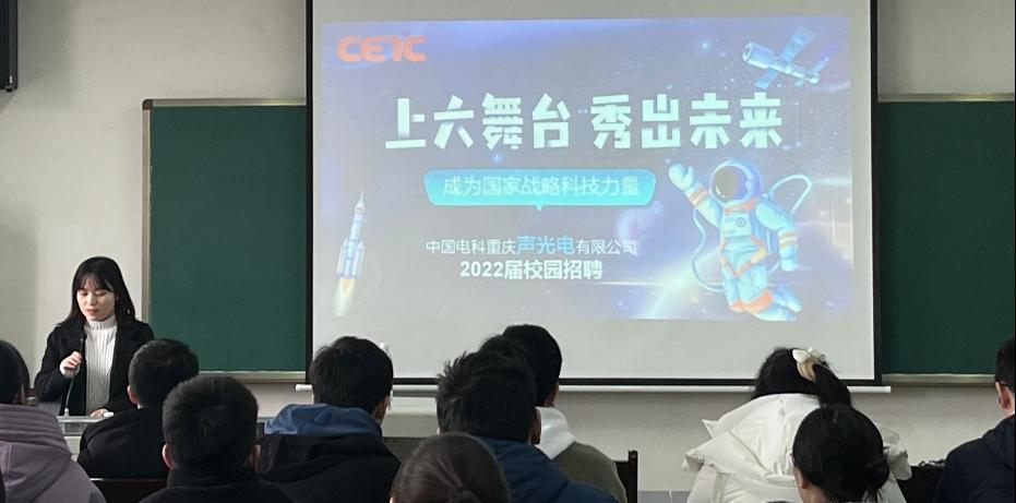公司人力资源部陈星老师向同学们介绍了中国电科集团重庆声光电有限公司的基本情况,总部位于重庆,北京、上海、成都均设有研发中心,拥有多区域工作机会。除此之外,公司拥有3个Ⅰ类研究所、1个国家级重点实验室、1个国家级博士后工作站。作为科技型中央企业(世界五百强),声光电致力于国家“十四五”重点发展领域,产品覆盖微电子、光电子、微声/惯性等多个方向,作为大国重器核心基石,为神舟、天问等重大工程提供了核心元器件。同时向大家介绍了他们的职位需求以及福利待遇,如五险两金、医疗补助、学历提升项目、定制化培训、双导师制、一对一职业生涯指导培养等。