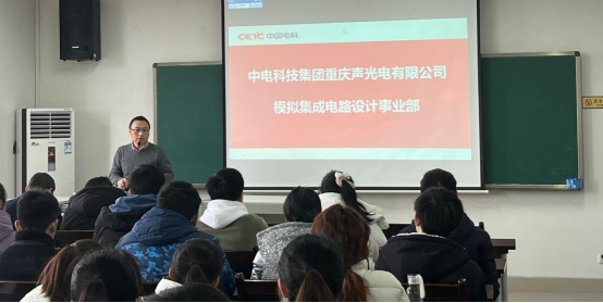 IC设计部副部长黄晓宗高级工程师从专业的角度,向同学们介绍了IC设计部以及军工部的发展规划、工作内容、岗位要求,并结合视频资料讲述了模拟集成电路设计的发展前景,以及我国芯片技术发展的破局之策,技术要领等相关内容,随后同学们也积极发言,咨询了各自关心的问题。