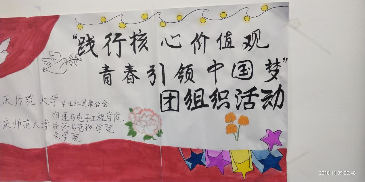 社团部,经济管理学院社团部,文学院社团部在弘德楼15105开展了“践行核心价值观,青春引领中国梦”团组织活动让广大青年在弘扬和践行社会主义核心价值观中勤学、修德、明辨、等实、爱国、励志、求真、力行,同人民一起奋斗,同人民一起前进,同人民一起梦想,用一生来践行跟党走的理想追求。