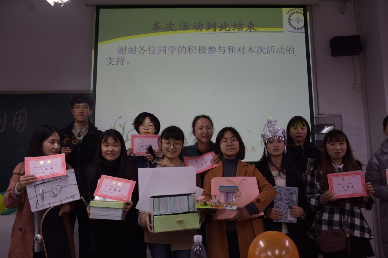 灵感来源于生活,平时作为垃圾的快递盒、塑料瓶、鸡蛋壳…甚至是一小块石头、一片落叶都能成为你作品的原材料,经过改造,这些材料变废为宝,减少麻烦的同时又给我们带来了方便。树上的落叶经过一双巧手的制作竟化为一袭美丽的长裙。一个个干松果经过上色晾干转身变成各色的花朵,再经过固定,一盆漂亮的盆栽就制成了。还有那来自于秋天萧瑟的枯枝与折好的花朵一起制成的相框,枯木逢春,如梦初醒。双十一之后,大量的快递盒子无处安放,有人把它改装成房子给流浪猫一个温暖的窝;有人将它改装制成鞋盒或是收纳盒;有人结合专业知识(物理学)与较强的动手能力,用转盘轮滑连带效应的原理,用三个转动的圆盘实现三位密码锁的设定,制成环保密码锁;还有人将它改造成一个蛋糕献给自己的父亲,里面装着满满的爱。冬天来了,为了做作业时脚不会冻冷,一小组利用纸板制作了一张桌子以便在床上使用…作品展示之后,便是节目表演,游戏环节,大家踊跃参加,最后公布获奖名单,获奖小组上台领取奖品并合照。