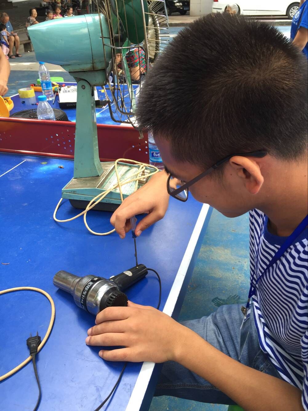 活动刚一开始,社区里的居民们都纷纷拿着小家电闻讯而来,场面十分火爆。拿来维修的家电都是些风扇吹风机按摩机之类的,大都是无法运作的。志愿者们积极而又耐心的帮助维修,有时候一个小家电要检查线路,松紧螺丝,都要花好几十分钟。可是,高温烈日也灼不灭我们的热情。在维修的过程中,也有小家电维修不好只能扔掉的情况,对此维修队员感到十分的抱歉。但是,家电的主人都对志愿者报以理解和感激。让志愿者的心里如同这夏日的炙阳一般,浓烈而温暖。后来大部分的小家电都被修好了。居民们都拿着自己的小家电开心而满足的离开了,临别的时候,还一直连连夸赞,赞扬这样的活动有意义,大学生有能力有爱心。这让志愿者感到异常的满足,被认可的幸福。