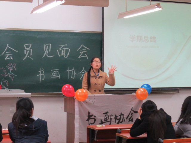 紧接着,在同学们的热烈欢迎下,组织部部长李艺上台交换了见解,并提出了书画协会存在的主旨——弘扬民族传统,共辉重师书写崛起文化;以书会友,挚艺术高峰;字如其人尽我校本色。在大会的最后,书画协会副会长孟慧娇指出:“书画协会的存在活跃了校园文化,营造了人文社会,充分发挥了当代大学生的才华和精神风貌。”同时她也对上学期书画协会的工作做出总结,她说:“上学期的书画协会是充满力量的,我们开展了一个又一个活动来激发学生们的积极性。”并承诺,“我们将会更加积极的开展形式多样、健康向上的活动,培养学生高尚的道德情操,激发大学生学习热情也为广大同学在校期间能有提高书写绘画水平,锻炼自身能力机会,促进学生全面发展。”