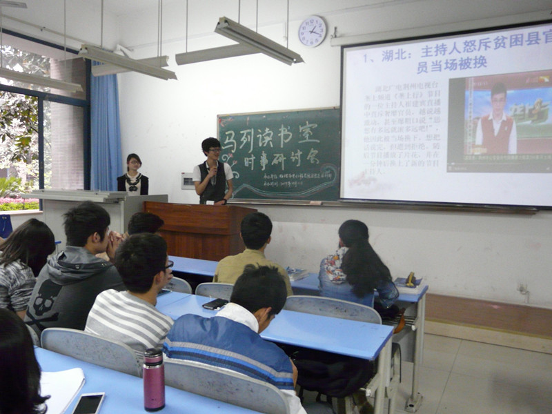 在研讨会上,主持人先给大家简单介绍了本次活动的目的:以交流促进步。接着他结合幻灯片放映让在座的同学们初步了解了最近的国际、国家大事,并将同学们分成若干小组分别进行组内讨论,然后由组员代表发言,展示小组讨论结果。到场的同学们针对时事积极参与讨论,发表自己独特的见解与想法。最后,马列部副部长沈萍为本次活动作总结。她对同学们的发言作了详细的点评,表扬了同学们在讨论会中积极的表现,同时也指出大家在讨论和做报告时的不足之处,提醒同学们在思考时需要注意的细节问题。