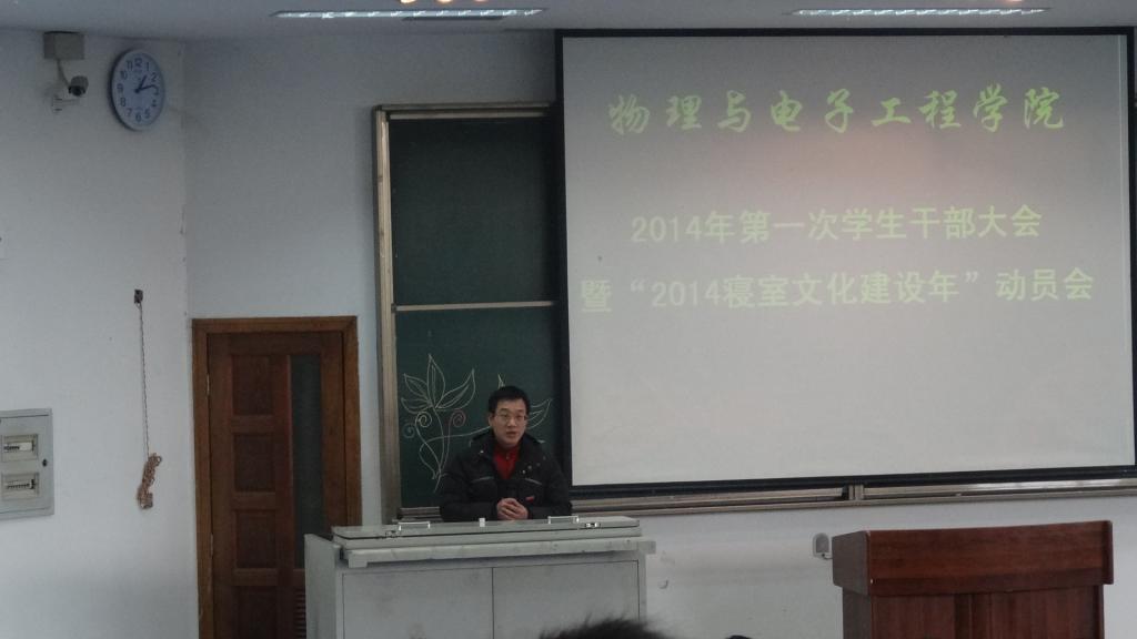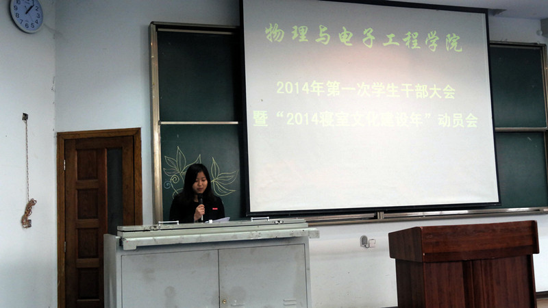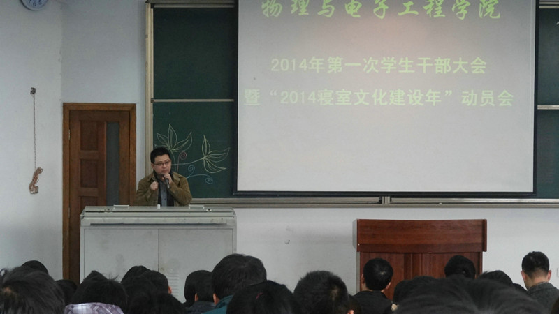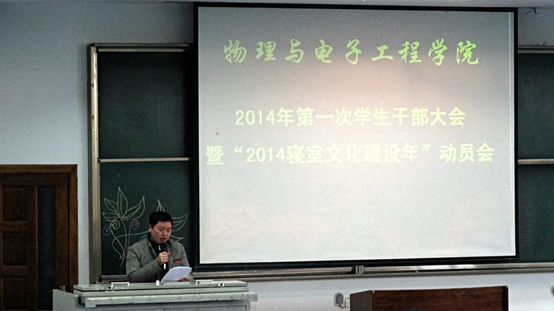 于2014年3月6日下午一点在弘德楼15205举行了新学期第一次学生干部大会暨“2014寝室文化建设年”动员会。此次动员会很荣幸的邀请到学校校学工部部长、学生处处长张明志老师、学工部副部长、学生处副处长唐加祥老师、校学生处学生事务管理科科长李鑫老师、AV狼