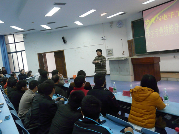 在会上,学院党总支副书记冉久飞老师首先为本次的学生专业技能大赛做动员演讲。“机会永远只留给有准备的人。”冉老师说。冉老师还告诉同学们,平时的技能训练会积累成一种迈向成功的经验,比赛的目的是让同学们得到锻炼,并鼓励同学们有信心、耐心、恒心,认真投入到比赛中。随后,学院专业老师针对物理学(师范)和电子技术两大专业的特色结合以往学生专业技能大赛的经验,分别给同学们进行了指导。师范生技能大赛指导老师冯庆给参赛者从赛前准备、项目准备、临场发挥等多个方面专业指导,最后他希望各参赛者在比赛过程中善于思考、总结以争取有所收获。电子科技制作大赛的指导老师宋培森则通过列一个实际参赛例子来告诉同学们参与过程虽然乏味但是只要坚持就会获得成功。“古来圣贤皆寂寞,惟有饮者留其名”,他相信大家会在坚守中成长,在磨砺中提升,在快乐中进步。
