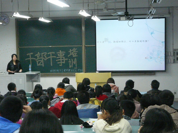 AV狼记者部部长唐颖作为此次公文写作培训的主讲人。参与培训的人员包括团总支·学生会各部门副部及干事,以及12、13级各班团支部书记和组织委员。