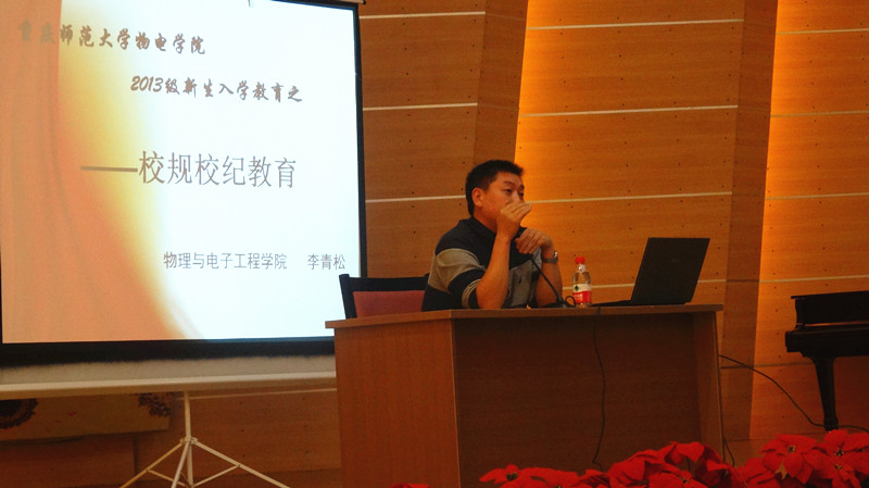 首先,李老师对13级全体新生的到来表示热烈的欢迎。然后,李老师对校规校纪进行了全面的解读,并要求全体同学牢守各条规则。小到日常行为习惯,大到集体责任意识,每一个同学都应该从基本做起,遵守条例,提高自己的自省、自律能力。接着,李老师简单介绍了学校和学院的一些常规管理工作,更是耐心的为同学们解读了学生学籍管理和学生学分制度。最后,李老师从思想教育的观点出发,开导大家在新的环境中要做好心理上的调节,尽量尽快地脱离自己的迷茫,树立积极向上的生活态度,完成自己经历过灰色高考后的美好大学梦想。