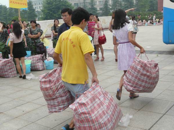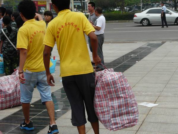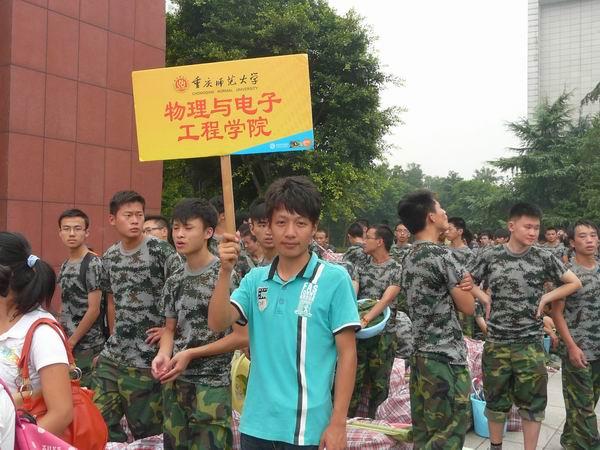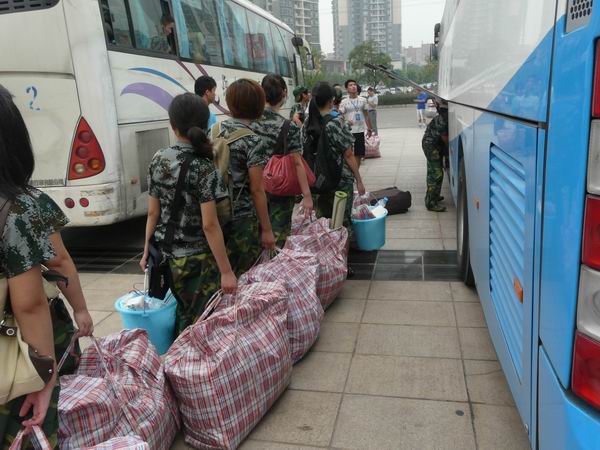 今日的迎新工作相对于前两天来说比较轻松,大部分2012级新生已经在7、8号报到完毕,只剩下大约数十个人尚未前来报到,所以今日的主要任务是让剩余未报到的新生走完迎新流程之后,将全部2012级新生送往璧山77146军训部队。一大早新生们就在忙活着准备出发去军训部队,在校园里到处都能见到身着绿军装的同学,他/她们朝气蓬勃,斗志昂扬。10点左右校正大门就已经挤满了人,按学院为单位排列在正大门后面的空地上,等待校车的接送。