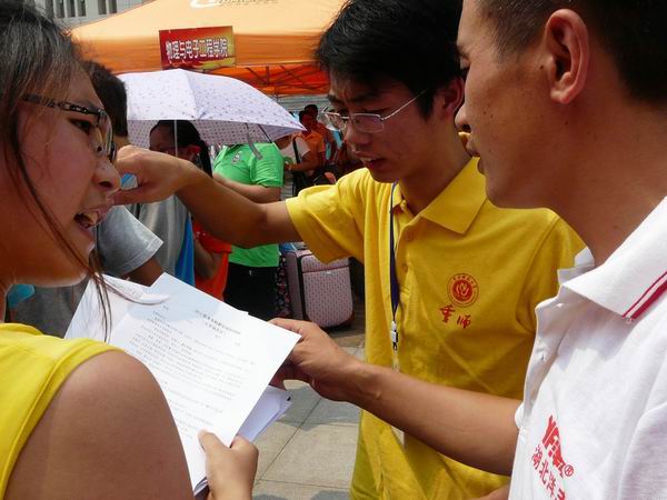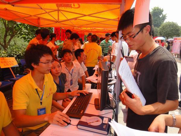 此次的迎新工作与往年一样,在烈日下火热地进行,各个学生会成员们及志愿者们穿梭在人群之中,为办好学弟学妹们的每件事情而大汗淋漓。今年的迎新工作流程与往年相比有所改变,新生来到首先为其安排一名志愿者,之后到工作平台进行身份证与录取通知书的信息核对,然后是校园一卡通发放,排队时有人员派发报到须知、个人须知等,再领取体检表和寝室钥匙及绿色通道、生源地贷款的特殊办理,之后体检、领取军训物资,最后在所有流程办完之后进行二次签到。
