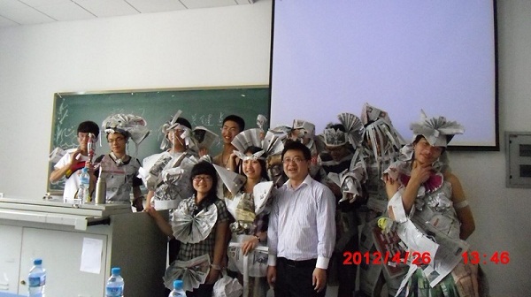 活动在一个别开生面的“模特时装秀”中展开了,大家按照周老师的要求,用手中的报纸作布料,胶带作针线来为模特设计时装,作品的风格为搞笑、夸张,意在让同学们大胆创新,新颖脱俗。同学们的参与热情很高,不一会儿各种“惊艳”的时装就设计完成了。接下来的时装展示更是体现出了同学们的思维创新能力,掌声、尖叫声不断,活动达到了小高潮。周老师对同学们的表现给予了高度的评价与肯定。