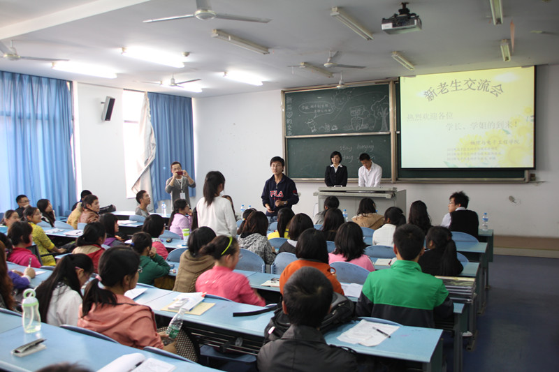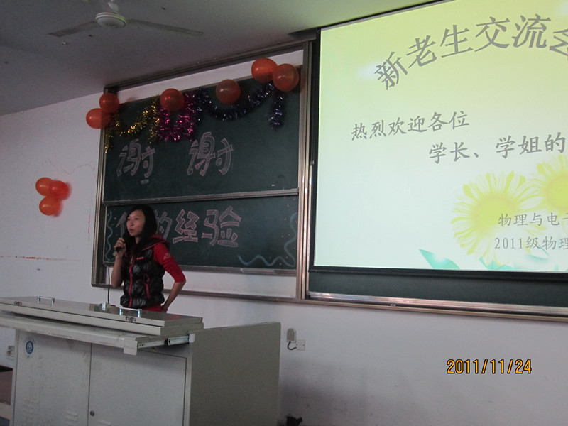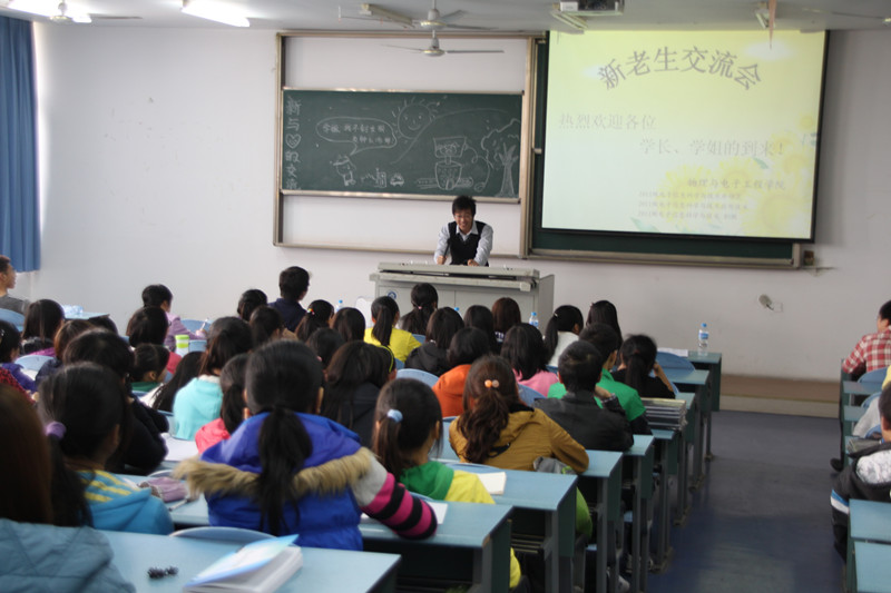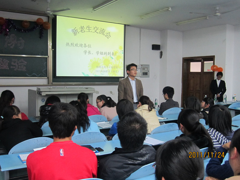 团总支学·生会举办,学习部承办的“2011——2012学年度新老生交流会”于2011年11月24日下午2:30,在大学城宏德楼15204和15302拉开帷幕。本次活动旨在传授新生大学生活和学习的经验,帮助新生走出大学迷茫,树立人生目标,使其尽早适应大学生活、融入大学生活。本次活动将分为两个班进行——2011级物理学,2011级电子班。