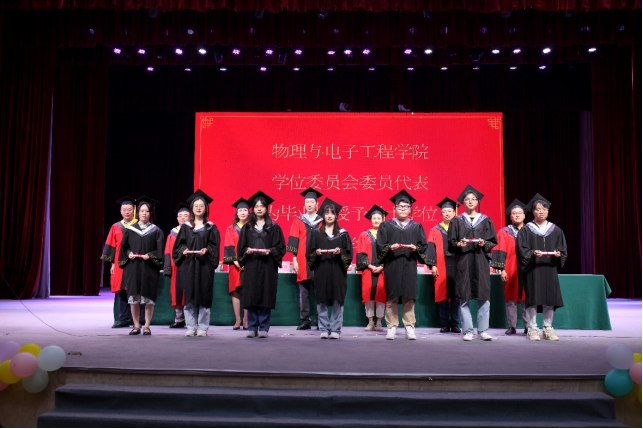 2023届学生毕业典礼暨学位授予仪式在校友会堂演出厅顺利举行。学院党委书记杨云,学院学位委员会主席、副院长(主持工作)余鹏,学院学位委员会副主席、副院长张丁可,学院学位委员会委员代表杨晓红、牛连斌,物理系主任李万俊,电子工程系主任罗海军,光电工程系主任吴建伟出席了典礼,各系部教师,全体辅导员和2023届全体毕业生参加。典礼由学院党委副书记曾艳主持。