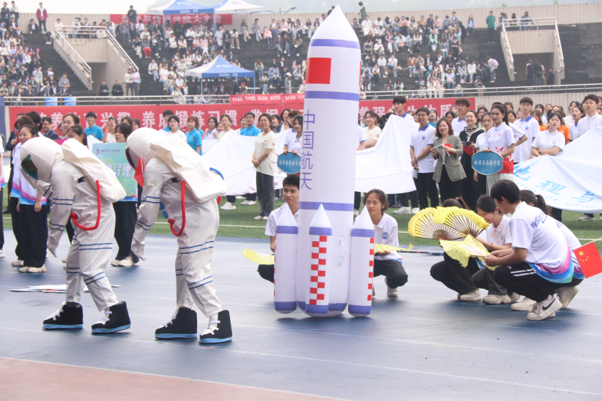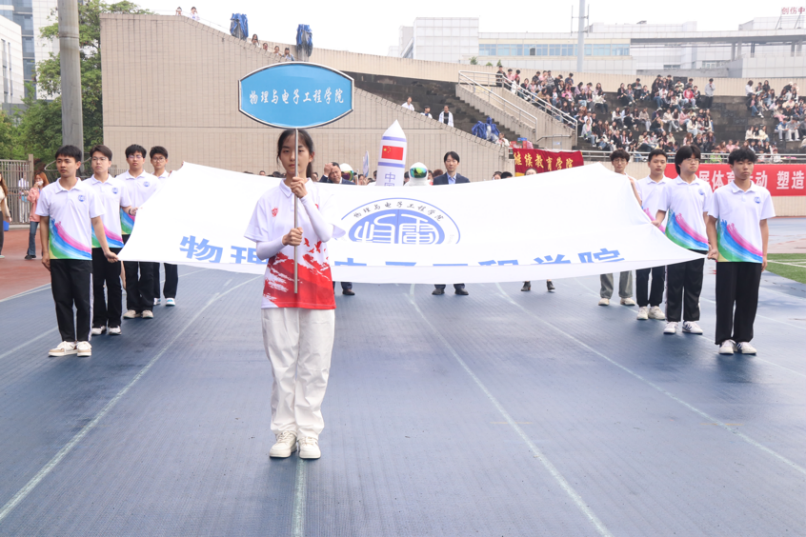 师生方阵身着统一服装,步伐矫健,神采飞扬,教职工手中的国旗迎风招展,学生们高举院牌,高喊“格物寻理,追电逐光,驰骋赛场,物电最强”,威武的口号掷地有声,彰显出物电师生坚定的信念与昂扬的斗志。更为引人注目的是,物电学子手举火箭模型,身穿宇航员服,展现出对科学探索的热爱与追求。近年来,AV狼