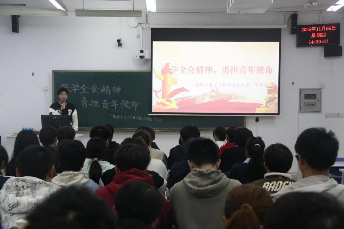 刘贝希同学围绕二十届四中全会精神开展宣讲。她表示,全会最重要的成果是审议通过了《中共中央关于制定国民经济和社会发展第十五个五年规划的建议》,它不仅是未来五年国家发展的行动纲领,更在接续推进中国式现代化建设关键时期的里程碑。她从四个维度展开:一是“十五五”时期经济社会发展主要目标,突出高质量发展、科技自立自强、全面深化改革等重点方向。二是强调坚持党的全面领导、人民至上、统筹发展和安全等重要遵循,为发展之路保驾护航。三是各领域重点任务部署,围绕建设现代化产业体系、加快高水平科技自立自强、推进乡村全面振兴等内容,为青年学子锚定奋斗坐标。四是坚持和加强党的全面领导的实践要求,通过完善党中央重大决策部署落实机制、推进作风建设常态化长效化等举措,筑牢党和国家事业发展根基。