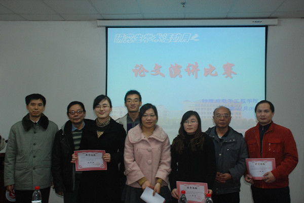 在比赛中,各选手用自己的方式结合自己所学专业精心准备论文,深入浅出地演讲,在讲台上用激情、热情、真情赢得了听众的一阵阵热烈地掌声。经过近两个小时的激烈角逐,光学工程专业赵永红获得了特等奖。最后,评委老师对此次比赛做出了精彩的点评,给各位获奖选手颁发了奖品并合影留念。