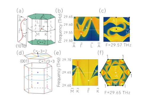 图1:(a)和(d)(10-10)和(001)表面布里渊区以及表面模式的示意图(b)(10-10)和(e)(001)表面上的投影声子表面模式。(c)和(f)分别显示了(10-10)和(001)表面在29.57和29.65THz的恒定频率切片上的声子双螺旋和六螺旋表面状态。
