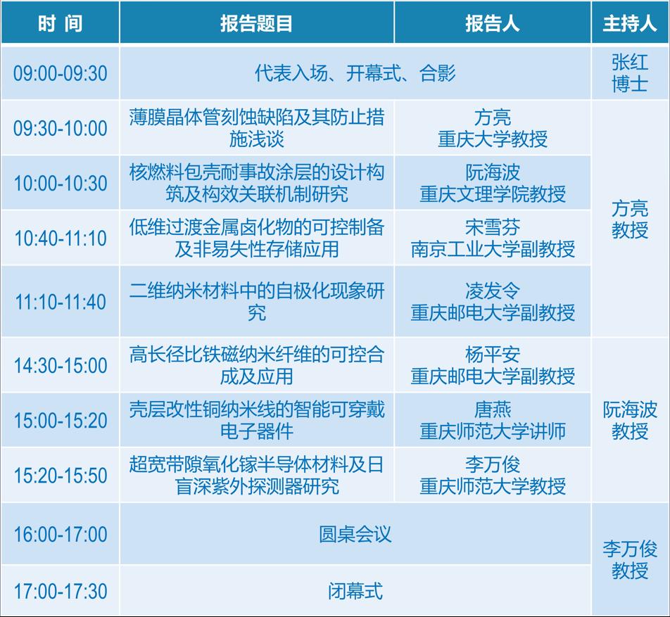 重庆大学方亮教授在报告中介绍了TFT叠层电极刻蚀缺陷的研究现状,并讨论其防止措施及相关科学问题;重庆文理学院阮海波教授以“核燃料包壳耐事故涂层问题的提出及研究现状”为题做专题报告,介绍其课题组在核燃料包壳耐事故涂层方面最新研究进展;南京工业大学的宋雪芬副教授介绍了低维过渡金属卤化物的可控制备及非易失性存储应用并分享其课题组在二维过渡金属卤化物及其在非易失性存储中的工作进展;重庆邮电大学凌发令副教授对二维纳米材料中的自极化现象对材料的电子结构、输运、表面活性等性质的影响做专题报告;重庆邮电大学杨平安副教授介绍了磁场辅助原位还原合成高长径比铁纳米线及包覆、轻质宽频带吸波涂层设计和柔性触觉传感器设计及应用;AV狼