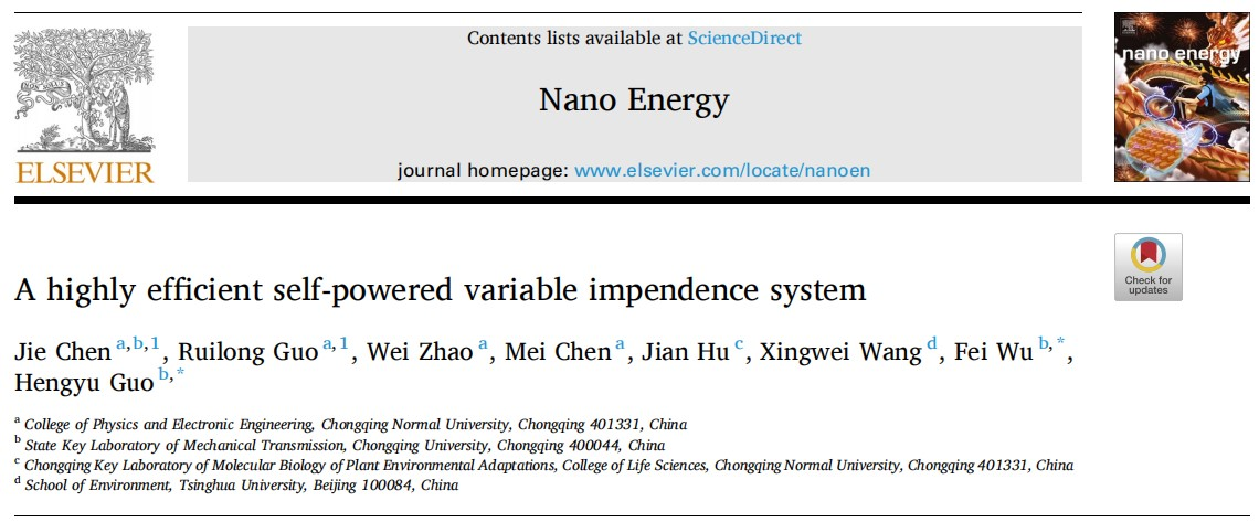 为第一署名单位,陈杰副教授、郭瑞龙(研究生)为共同第一作者,赵伟、陈美(本科生)、生命科学学院胡建老师共同贡献,在能源类TOP期刊《Nano Energy》上发表(中科院1区,影响因子16.8)上发表题为“A highly efficient self-powered variable impendence system”的学术论文。