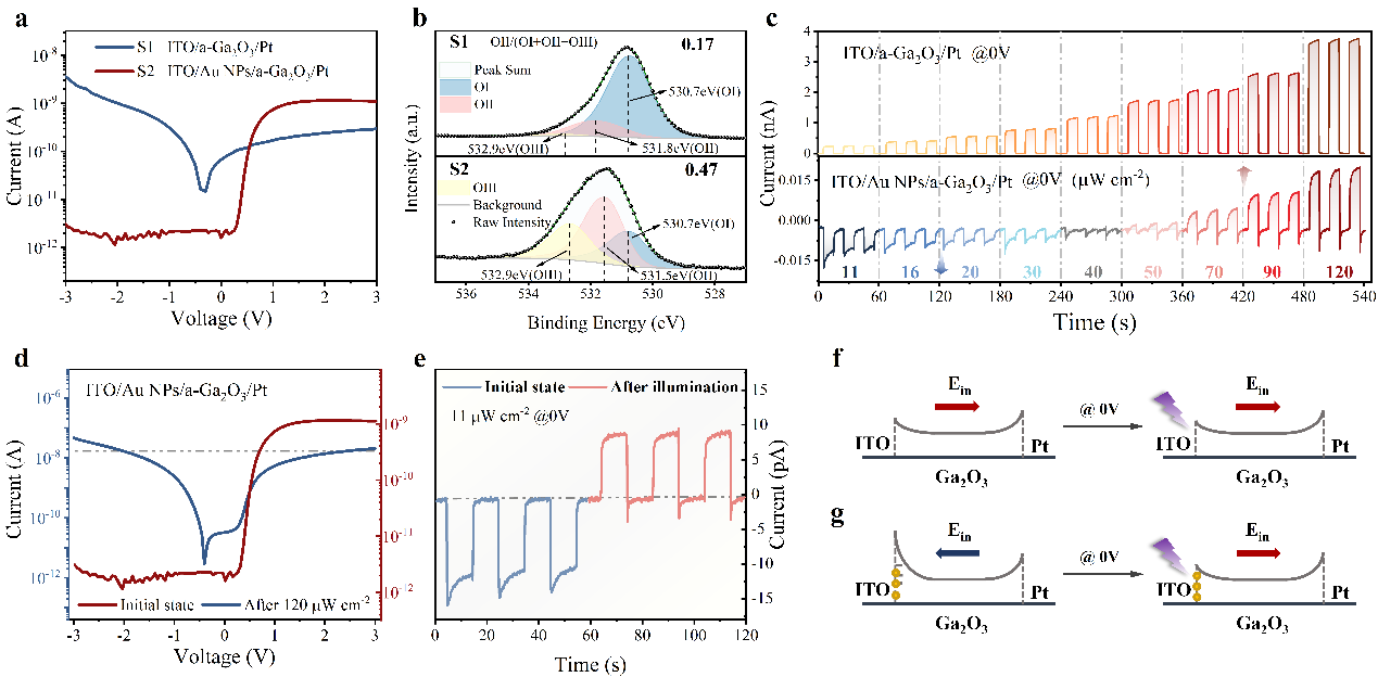 该项研究成果报道了一种两端垂直型光电器件,基于Au NPs的界面修饰,显著地增强了界面处的肖特基势垒高度。同时Au NPs作为电荷捕获层,通过光场作用对势垒进行灵敏且大规模的调制,从而实现器件的势垒极性的非易失性反转。这种创新的方法实现了具有超大开/关比(~104)和超过12000 s的优异保持能力的可控多级数据存储。此外,该器件模拟了基本的突触功能,并在视觉弱信号感知和图像记忆方面展示了个潜在的应用价值。这项研究介绍了肖特基势垒极性控制的机制,并提出了一个有前途的战略,为未来的高性能集成器件和光电突触元件的发展。