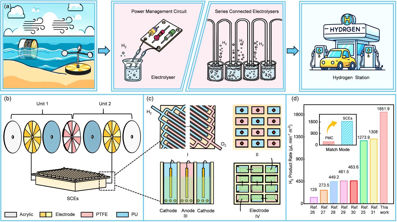 氢能是全球能源格局低碳转型的关键载体,其绿色制备技术备受关注。基于摩擦纳米发电机(TENGs)的环境机械能收集技术,为海水电解制氢提供了可持续解决方案,但TENGs与电解槽的阻抗失配问题严重制约能量利用效率。传统方案依赖电源管理电路(PMCs)进行阻抗调节,但会造成显著能量损耗并增加系统复杂度。对此,研究团队创新性开发出自供电的海水电解系统,实现了电荷迁移摩擦纳米发电机(CM-TENG)与串联电解池(SCEs)之间的直接阻抗匹配,将电能利用效率提升至98.9%,产氢速率达到1851.9 μL min⁻¹ m⁻⟡,优于以往研究。该系统与传统的TENG驱动电解系统不同,直接阻抗匹配策略显著降低了系统复杂性和额外能源消耗,提高了能量利用效率,为高效绿色制氢开辟新路径。