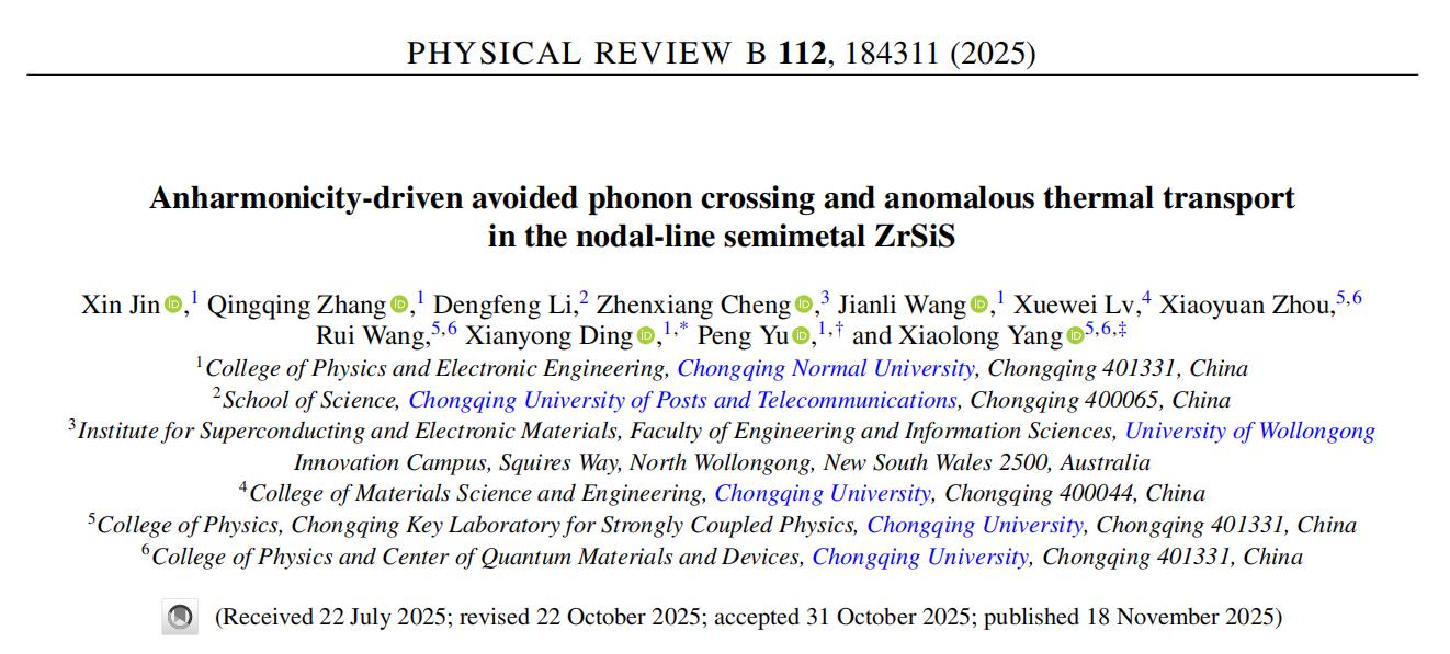 在国际期刊《Physical Review B》(物理类自然指数期刊)上发表题为“Anharmonicity-driven avoided phonon crossing and anomalous thermal transport in the nodal-line semimetal ZrSiS”的研究论文。论文由AV狼
