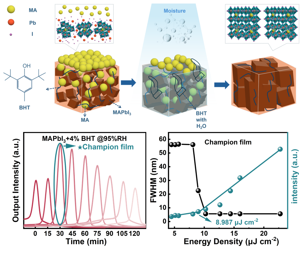 片上集成光子学的飞速发展,对微纳激光的小型化、低功耗与高稳定性提出了严苛要求。钙钛矿材料凭借优异的光电性能、可调带隙及高光学增益系数,成为微纳激光领域极具潜力的增益介质,但环境稳定性差(尤其易受水分降解)的痛点长期制约其产业化进程。令人意外的是,水分对钙钛矿并非 “全然有害”---适量水分可促进结晶,却因作用窗口极窄难以控制。针对以上问题,AV狼 张丁可教授与东北师范大学付申成教授联合攻关,提出水分与二丁基羟基甲苯(BHT)协同调控策略,成功制备出低缺陷密度的甲脒铅碘(MAPbI₃)钙钛矿薄膜。该薄膜在纳秒脉冲激光激发下实现8.987 μJ cm⁻⟡的超低放大自发辐射(ASE)阈值,为当前同类研究最低值;同时在室温环境下存储30天后,ASE强度仍保持100%,实现效率与稳定性的双重突破。相关研究成果为钙钛矿激光的实用化提供了全新范式。未来,随着电泵浦技术的进一步突破,该类优质钙钛矿薄膜有望应用于片上集成激光器件、微型激光传感器、高清激光显示等领域,推动光子学技术向小型化、低功耗、高稳定性方向迈进。