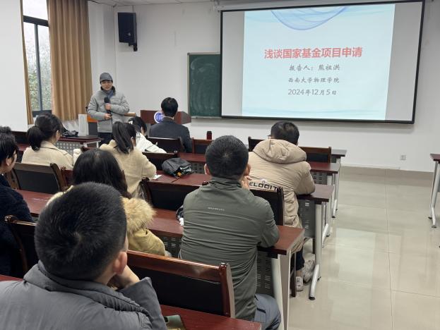 邀请到了西南大学熊祖洪教授,为全院师生带来了一场题为“浅谈国家自然科学基金项目申请”的专题报告。今年学院将申报国家自然科学基金项目的全体教师参加了会议,报告会由学院院长余鹏教授主持。